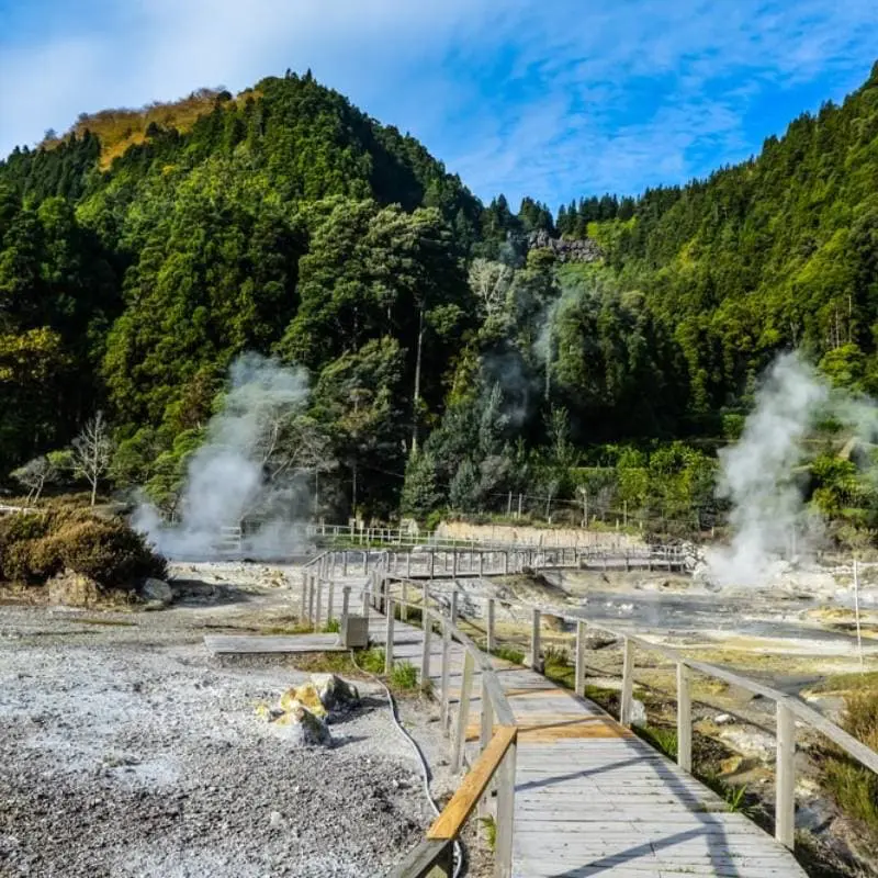 Dopo colazione, ci spostiamo a Furnas, una località famosa per le sue caldere e sorgenti termali. Qui assisttiamo alla preparazione del Cozido das Furnas, uno stufato di carne cotto sottoterra grazie al calore vulcanico e che gusteremo a pranzo, vivendo un’esperienza autentica legata all’energia geotermica del luogo. Dopo pranzo, facciamo una passeggiata intorno al lago di Furnas, ammirando la flora locale e l’evidente attività vulcanica. Visitiamo poi la Caldeira de Pero Botelho, nota come la “Bocca dell’inferno“, con le sue impressionanti fumarole e sorgenti calde. Infine, ci fermiamo al Pico de Ferro, un punto panoramico con una vista spettacolare sulla valle di Furnas e i suoi paesaggi vulcanici. Nel pomeriggio, ci rilassiamo presso il parco botanico di Terra Nostra, dove puoi immergerti in una piscina termale con acqua calda tra i 35 e i 40 gradi. Per concludere la giornata, visitiamo l’unica piantagione di tè in Europa, scoprendo il processo completo di lavorazione del tè, dalla raccolta all’essiccazione. Avrai l’opportunità di assaggiare il tè locale e acquistarlo come ricordo.